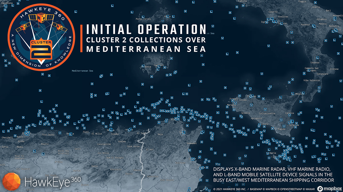 Herndon, Virginia (March 31, 2021) — HawkEye 360 Inc., the first commercial company to use formation-flying satellites to create a new class of radio frequency (RF) data and data analytics, today announced that its recently-launched “Cluster 2” satellites have achieved initial operating capability. The trio of satellites, which entered orbit aboard a SpaceX Falcon 9 rocket in January, have completed functional testing, moved into proper formation, and begun to geolocate RF signals. They are currently supplying RF data to customers and will soon ramp up output to reach full operating capability.