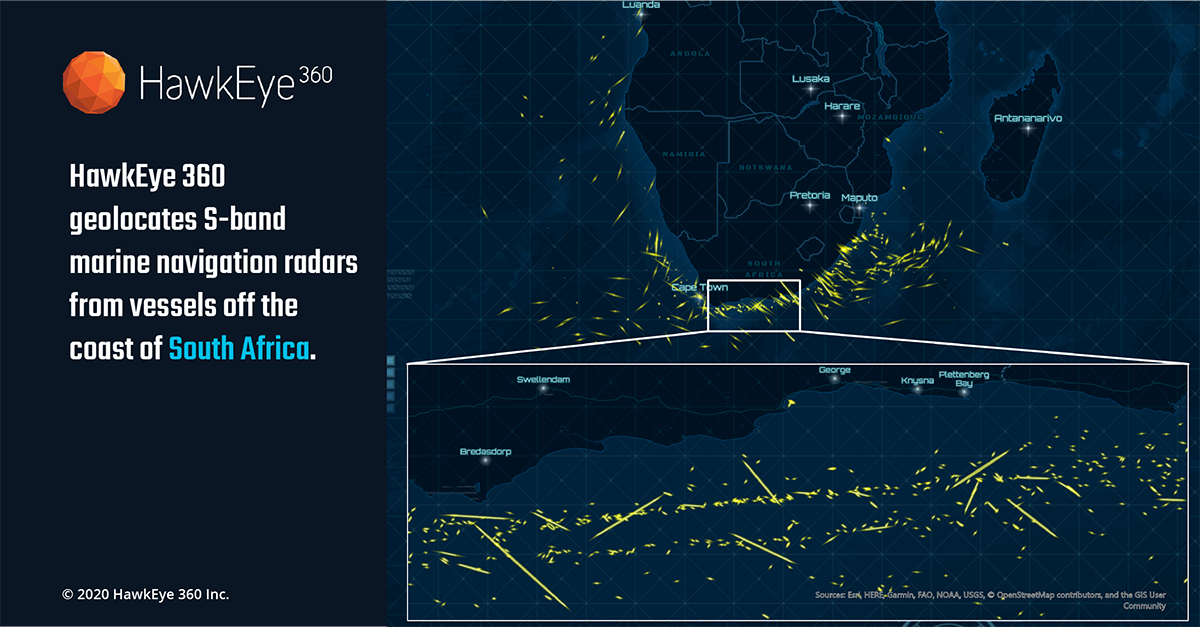 Herndon, Virginia (June 25, 2020) —HawkEye 360 Inc., the first commercial company to use formation flying satellites to create a new class of radio frequency (RF) data and data analytics, today announced that the company’s flagship RFGeo product can now map an expanded catalog of marine navigation radar signals to further improve global maritime situational awareness. With this update, HawkEye 360 introduces the first S-band radar signal and quadruples the number of X-band radar signals in the company’s library. HawkEye 360 can now cover the most used frequencies for X-band magnetron-based radar systems, providing a more comprehensive view of maritime activity.