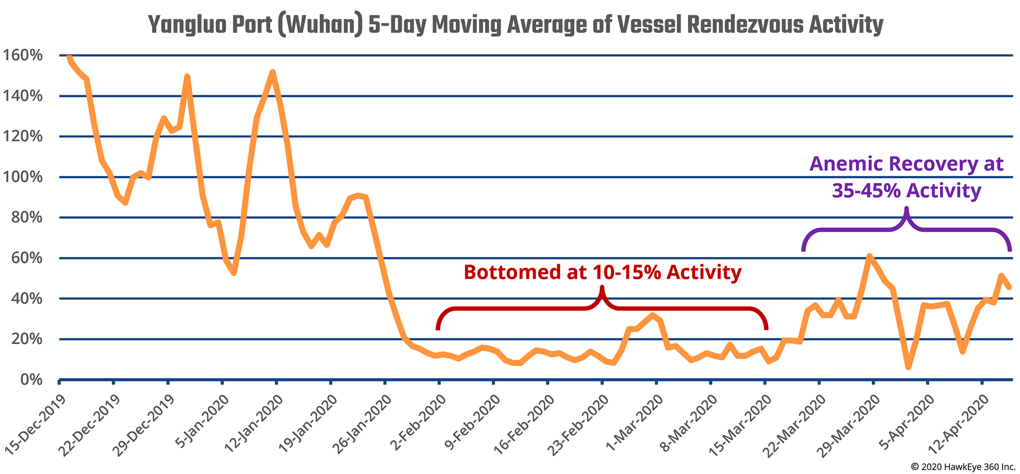 HawkEye 360 utilized its SEAker® product to analyze changes in patterns of vessel behavior in and adjacent to Yangluo over a four-month period as an indicator of economic activity. SEAKer uses proprietary algorithms to generate counts of rendezvous activity based on vessel Automatic Identification System (AIS) beacon data. In this way, HawkEye 360 can offer a more accurate and detailed look at economic recovery in Wuhan.
