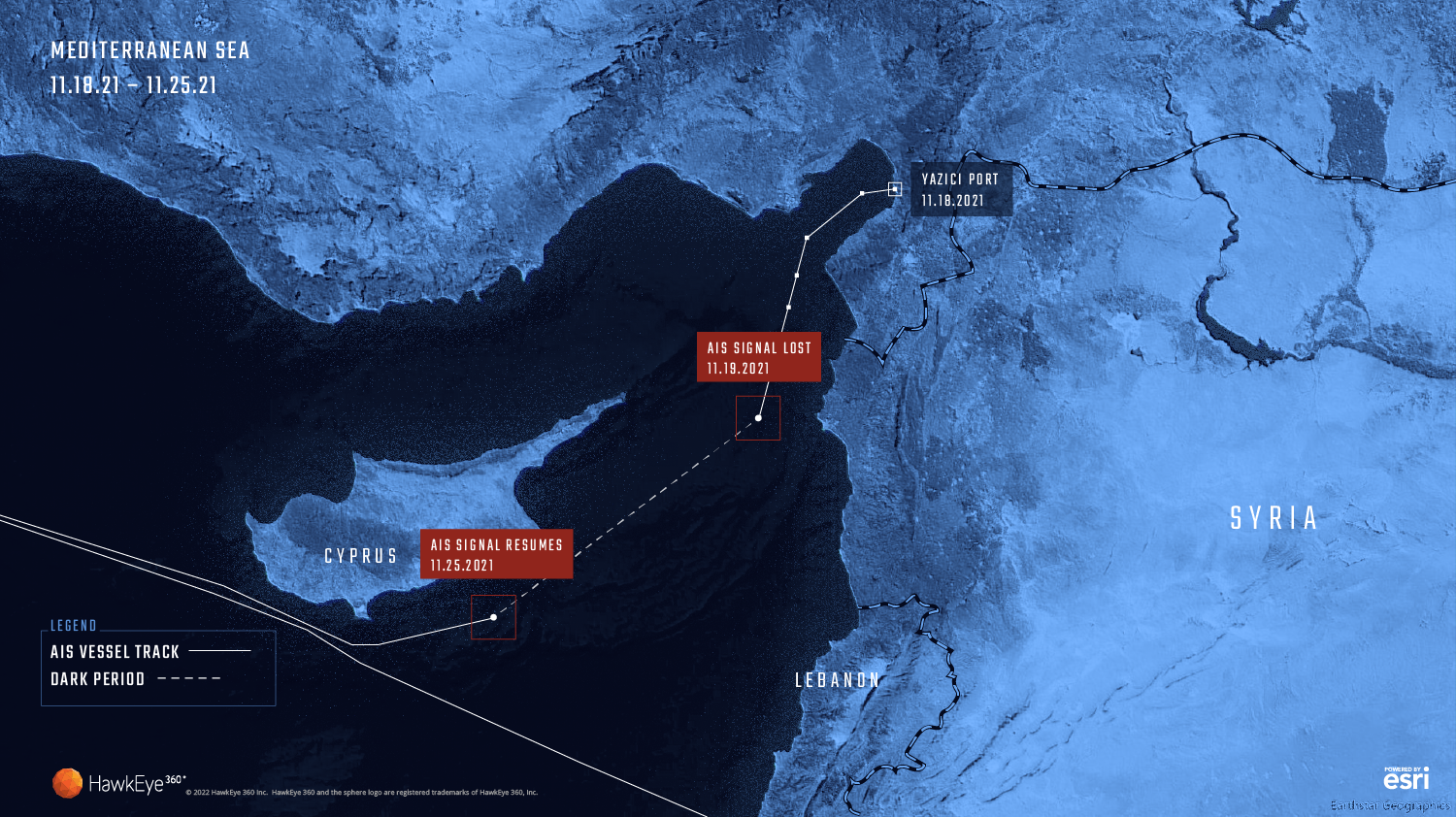 On November 18, 2021, a Honduras-flagged cargo vessel left the Yazıcı Port in Turkey and headed southwest through the Gulf of Alexandretta. It’s AIS transmission tagged the ship as CPT. AHMAD II: 334990000. Three days into its voyage, the ship’s AIS transmissions stopped west of Al Ladhiqiyah and remained off for a full week. On November 25, the AIS signal began transmitting again near the southern coast of Cyprus.