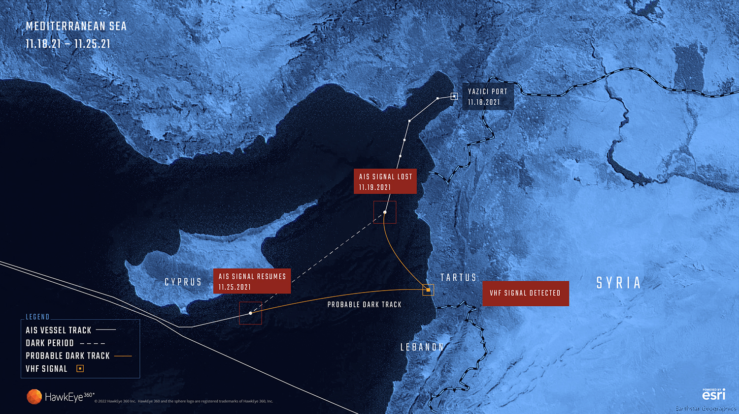 HawkEye 360 reveals dark activity on the Mediterranean coast of Syria.