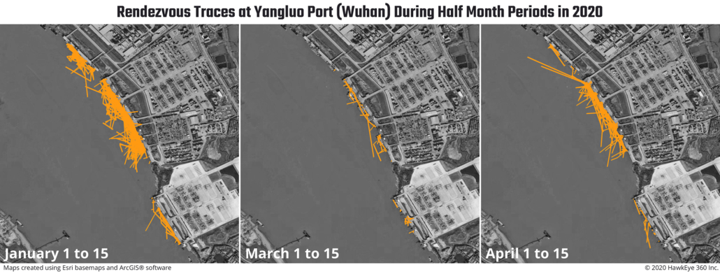 HawkEye 360 utilized its SEAker® product to analyze changes in patterns of vessel behavior in and adjacent to Yangluo over a four-month period. Yangluo Port and the surrounding Wuhan New Port complex is located along the Yangtze River and is the primary cargo center for the Wuhan region.
